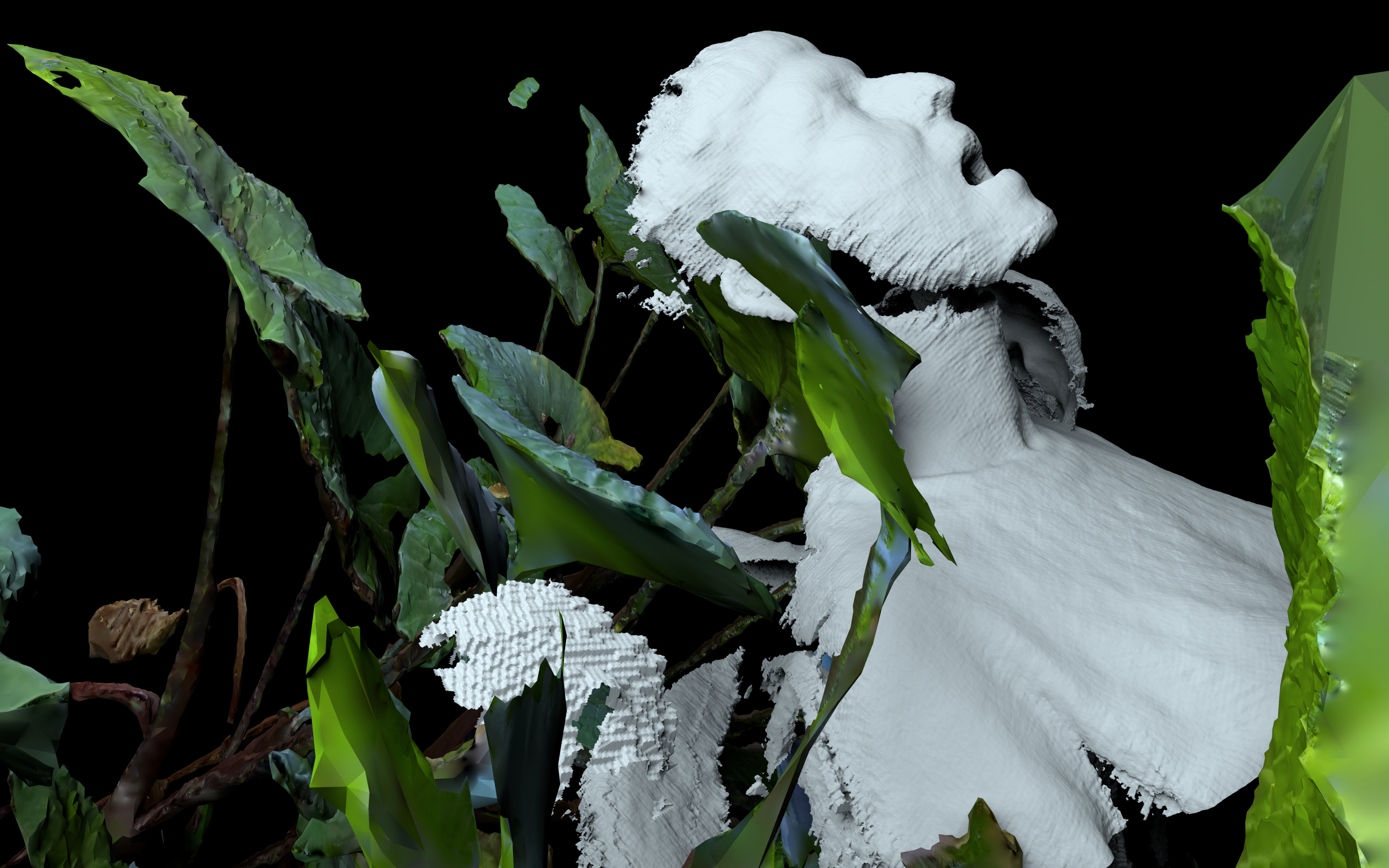 Through the fusion of 3D modeled plant life and human movement using motion capture data, "Ecological Adaptation" blurs the boundaries between species and challenges the assumed dominance of humans. This hybrid form disrupts traditional notions of gender and species roles, opening up possibilities for new ways of perceiving and relating to the natural world.