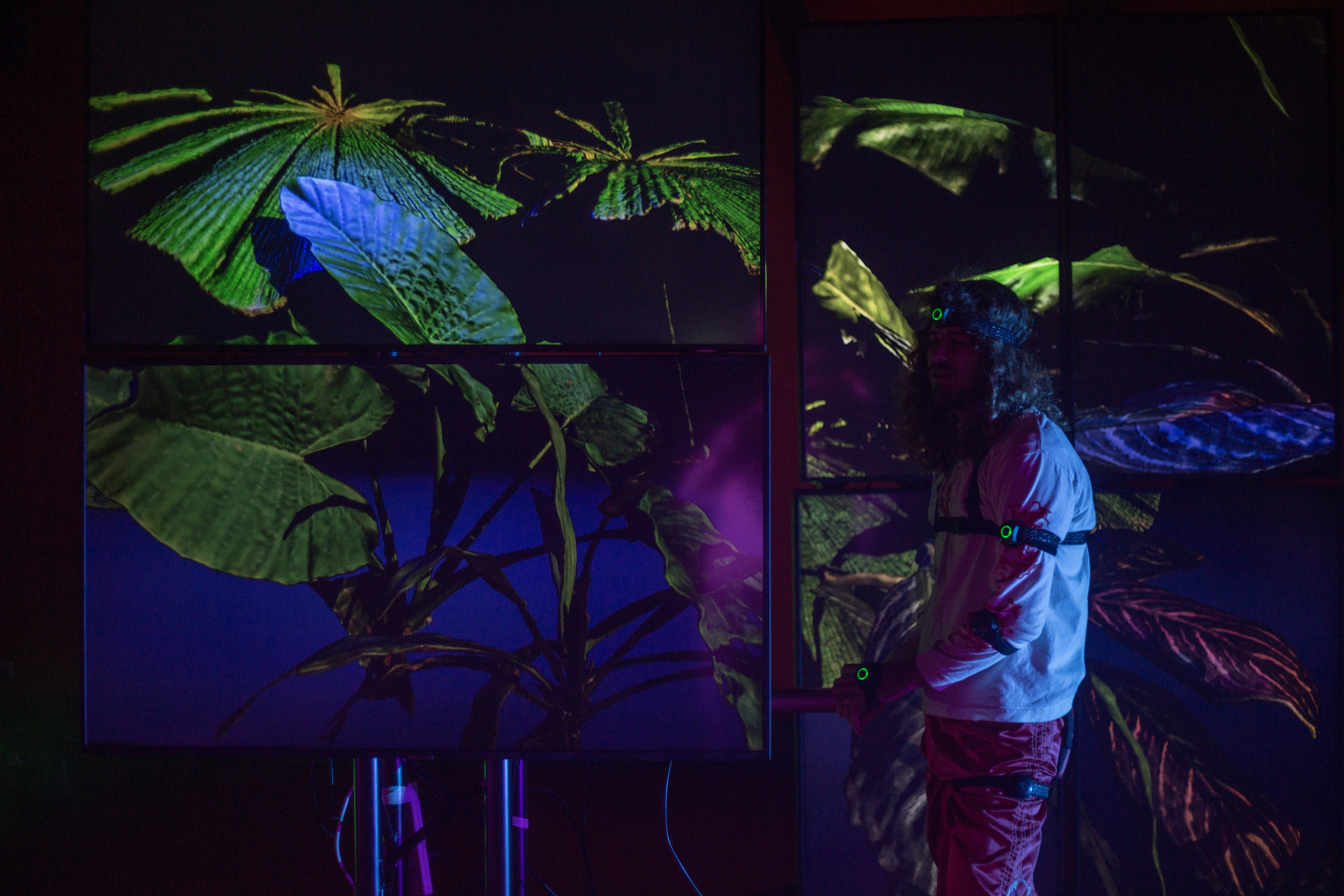 "Ecological Adaptation" is a transdisciplinary installation that explores the interconnectedness between humans, nature and technology. It seeks to interrogate and ultimately move beyond human-centric paradigms through embodied, machine-assisted explorations of more-than-human worlds. The installation consists of large movable LED screens that display a virtual environment of 3D-modelled plant life.