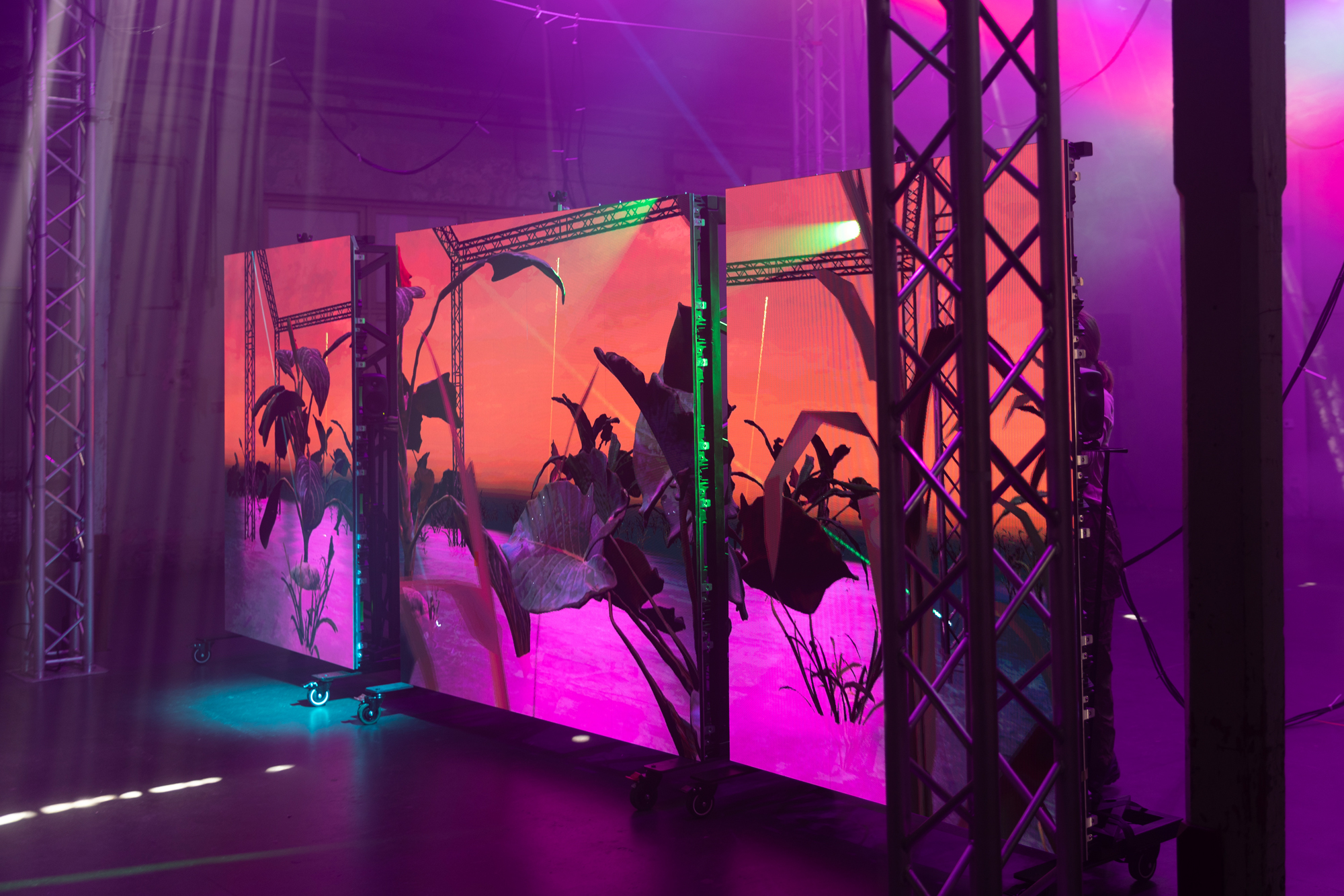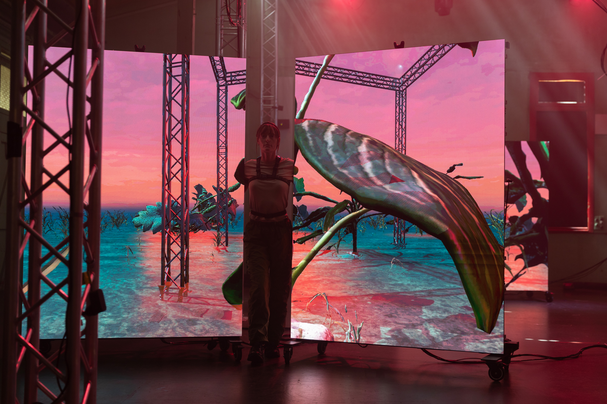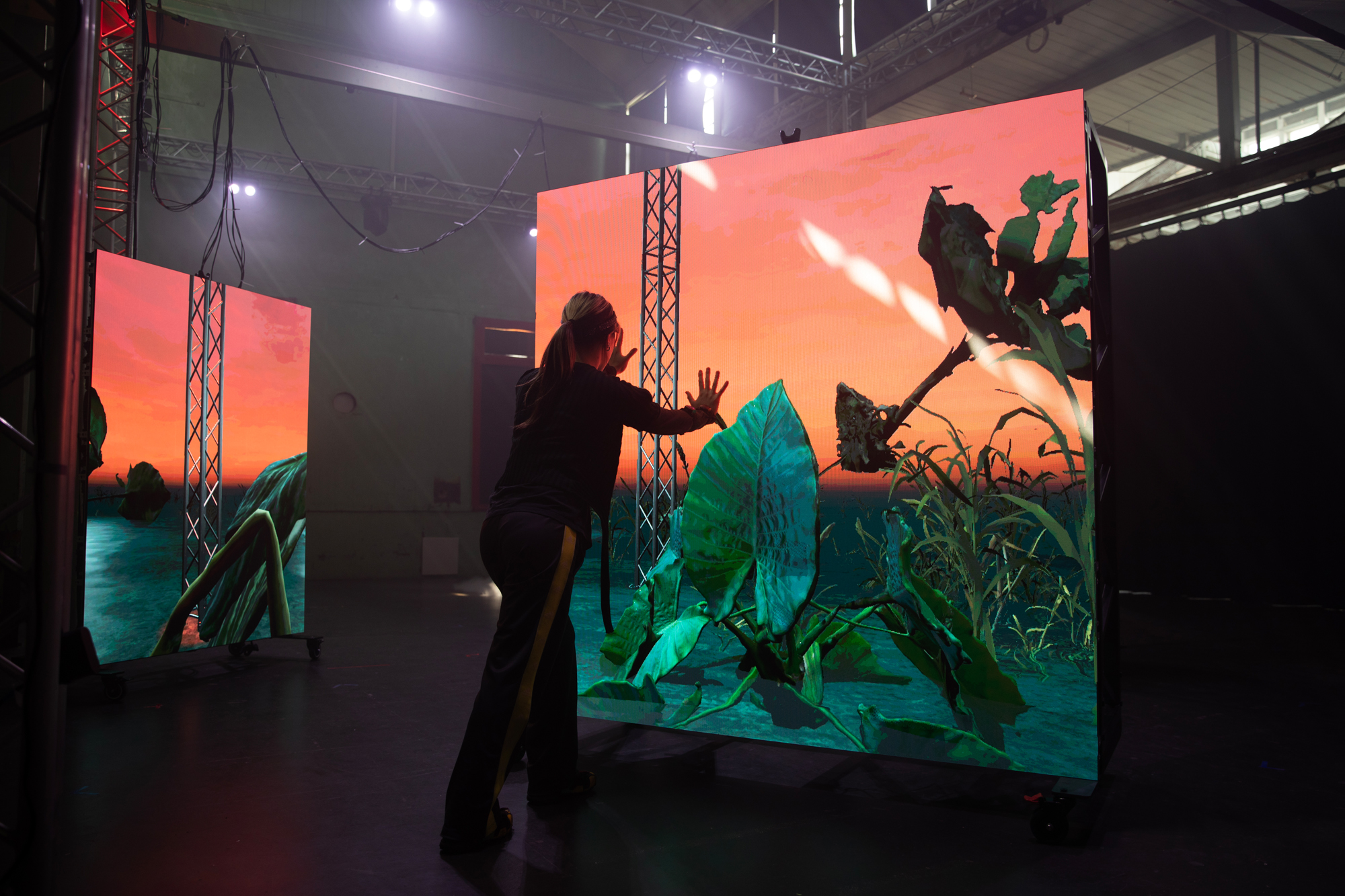 "Ecological Adaptation" is a transdisciplinary installation that explores the interconnectedness between humans, nature and technology. It seeks to interrogate and ultimately move beyond human-centric paradigms through embodied, machine-assisted explorations of more-than-human worlds. The installation consists of large movable LED screens that display a virtual environment of 3D-modelled plant life.