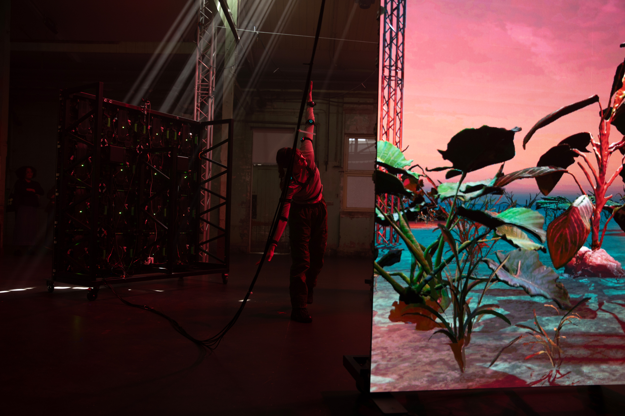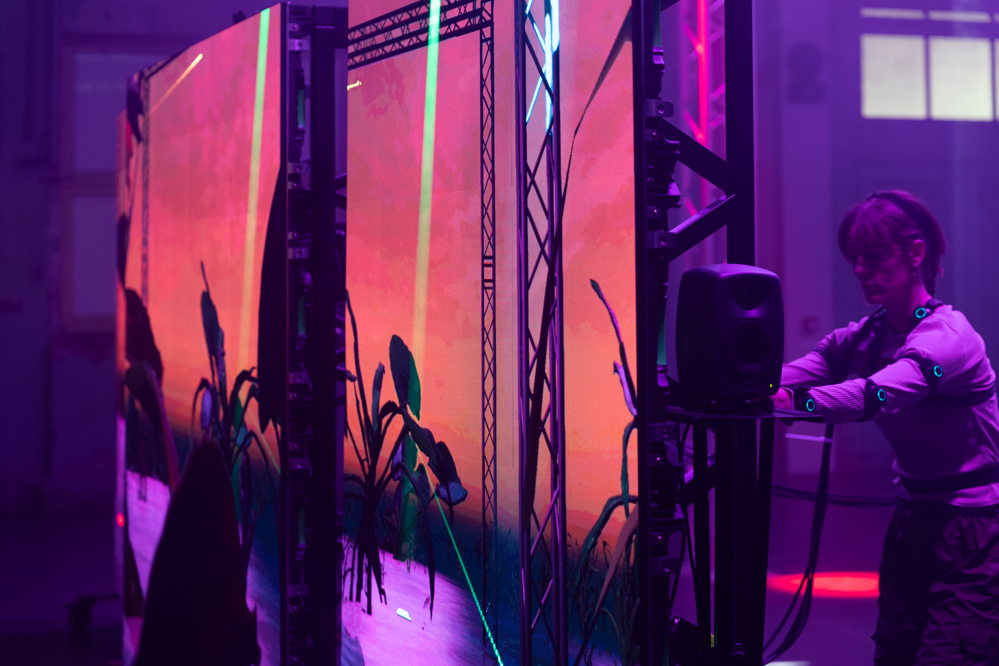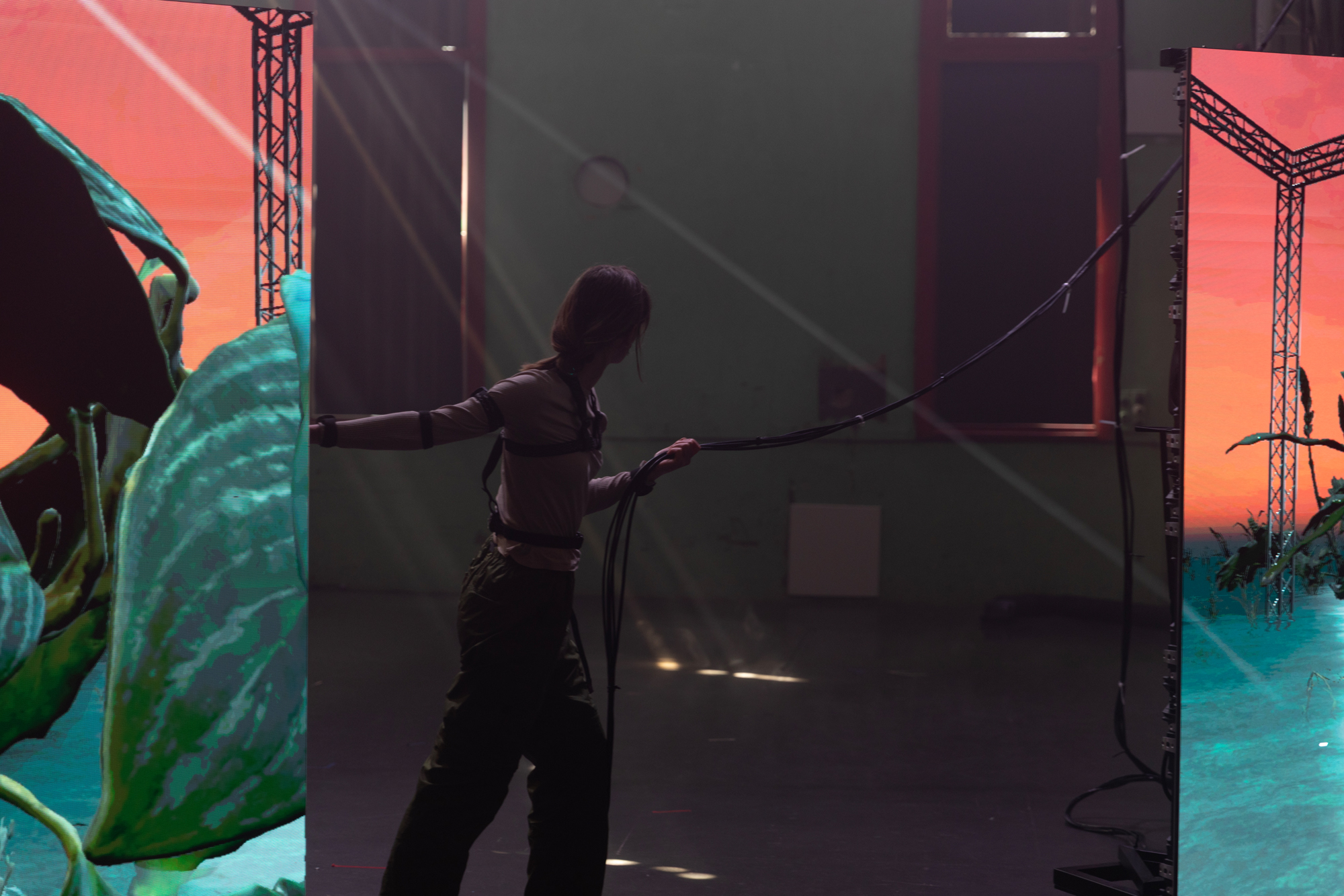 "Ecological Adaptation" is a transdisciplinary installation that explores the interconnectedness between humans, nature and technology. It seeks to interrogate and ultimately move beyond human-centric paradigms through embodied, machine-assisted explorations of more-than-human worlds. The installation consists of large movable LED screens that display a virtual environment of 3D-modelled plant life.